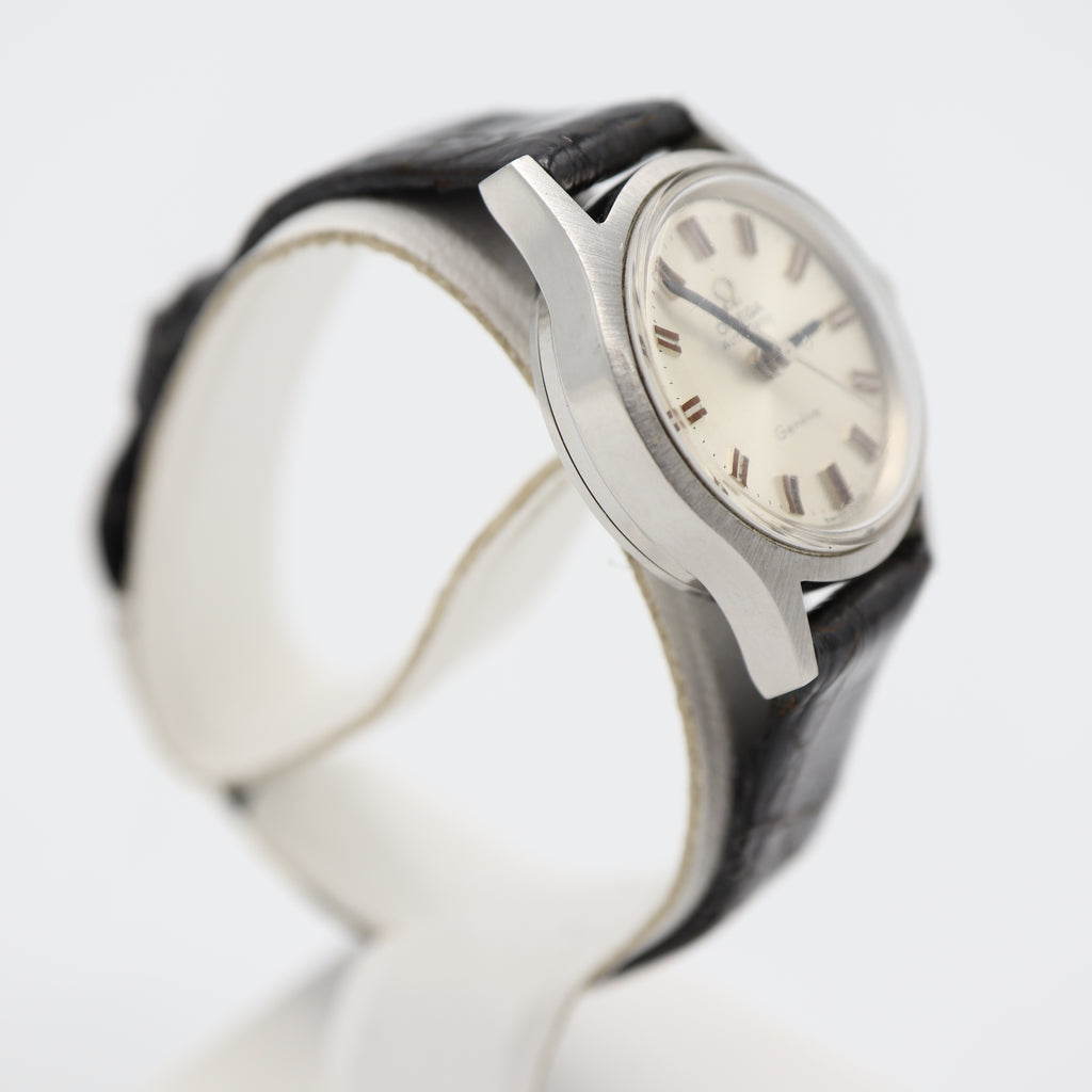 商品説明:OMEGAのジュネーブ腕時計です。※ベルトは社外品です。 Bランク:使用保管に伴い風防、裏蓋やケースに傷、ベルト汚れ等の使用感が見受けられます。現在稼働しております。タイムグラファー平置きで日差8秒程となっておりますが、姿勢差などによりますので参考程度にお考え下さい。 修理やメンテナンスが必要になった場合は落札者様負担となりますのでご了承いただける方のみご入札をお願いいたします。