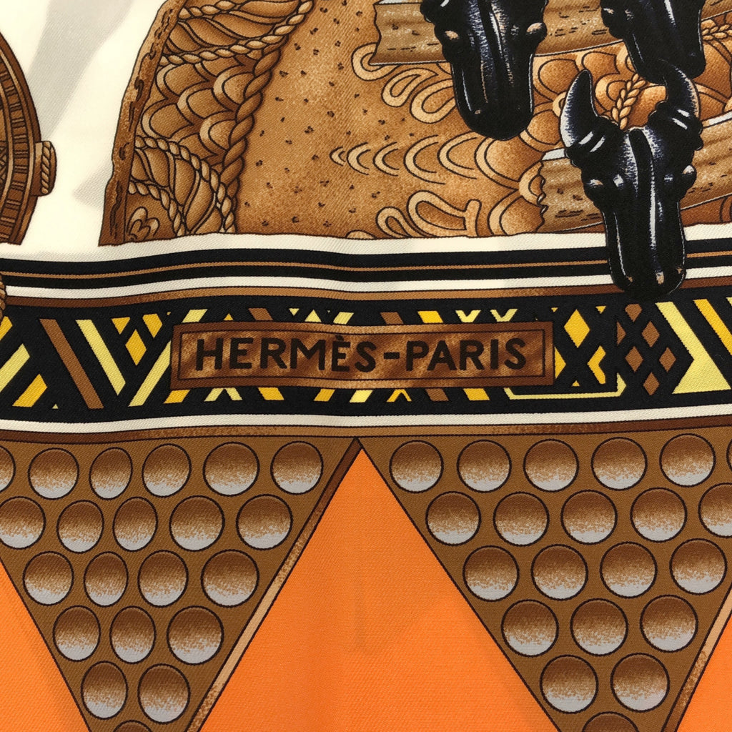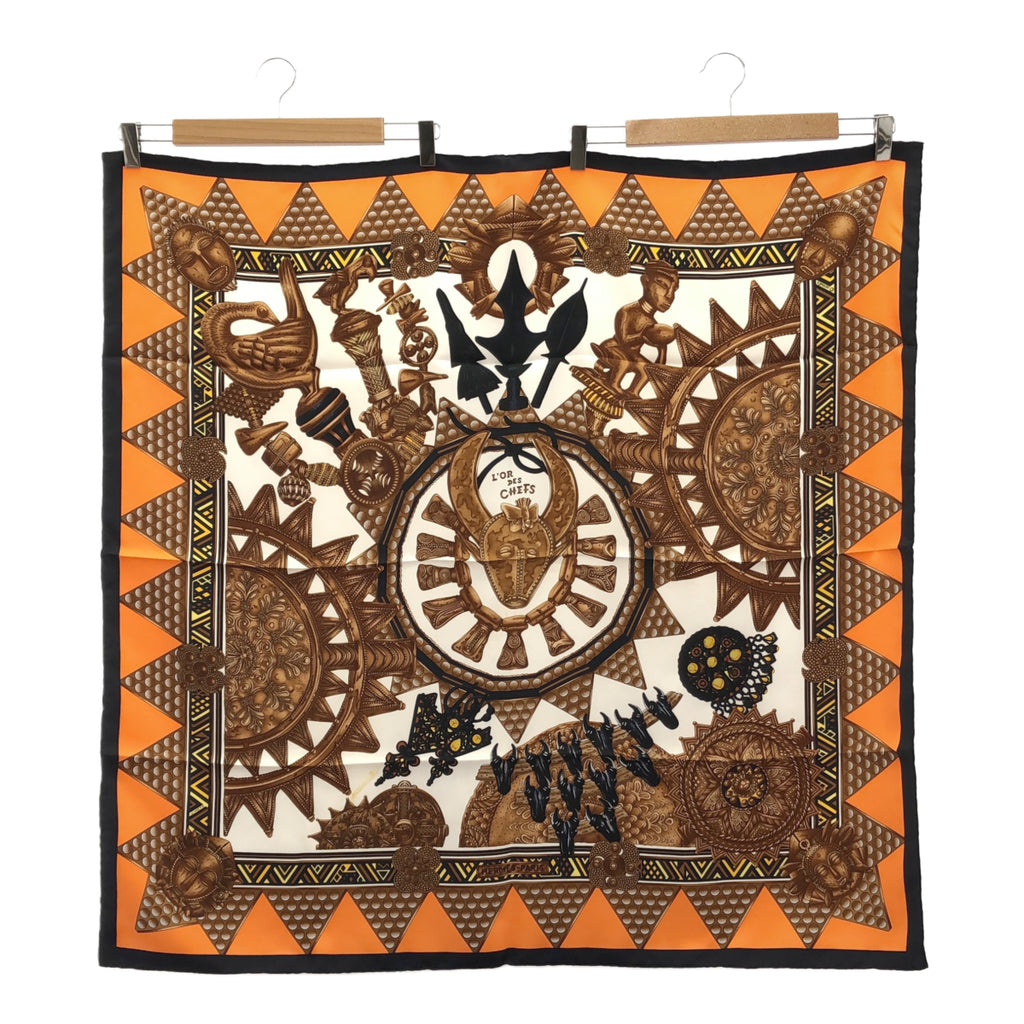 HERMES エルメス カレ90 L’OR DES CHEFS 首長達の金 シルク100% ブラック系 オレンジ系 服飾小物 箱有 25s78-1